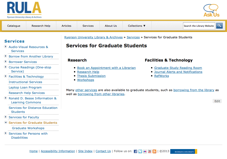 A couple of the ‘Services for…’ pages don’t really belong to anyone and they suffered from some of the same problems as the old Services page. I got our co-op student to look them over and suggest changes. Here’s what we came up with for the Graduates page: